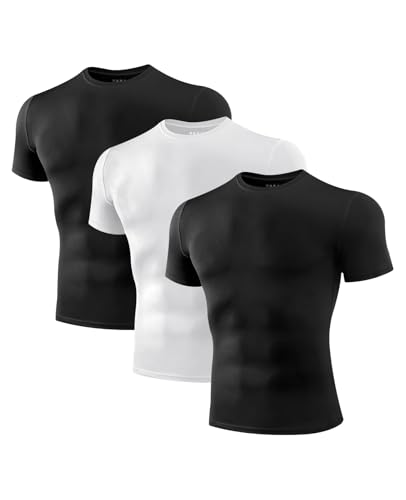 Niksa Compression Shirt Men, 3 Packs Short Sleeve Gym T Shirts Men's Muscle Fit T-Shirt Breathable Active Wear T Shirt Base Layers Quick Dry Tops for Running Cycling Sports, Black and White, XL