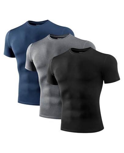 Niksa Compression Shirt Men, 3 Packs Short Sleeve Gym T Shirts Men's Muscle Fit T-Shirt Breathable Active Wear T Shirt Base Layers Quick Dry Tops for Running Cycling Sports, Black Grey Navy Blue, S