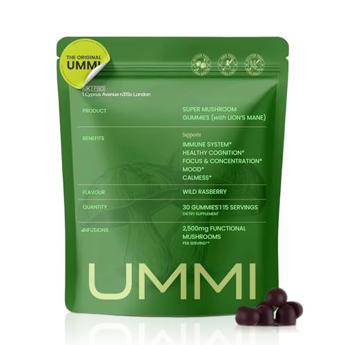 UMMI 12-in-1 Super Mushroom Gummies with Lion's Mane, Reishi, Cordyceps - 2500mg Functional Mushrooms Complex for Immunity, Focus, Mood & Energy - Vegan Supplements, Raspberry Flavour (30 Gummies)