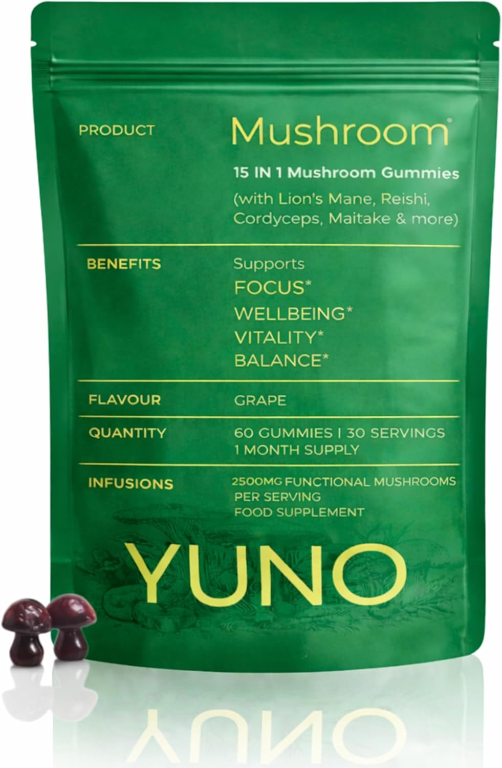 Yuno 15-In-1 Functional Mushroom Gummies – Lion’S Mane, Reishi, Cordyceps & More