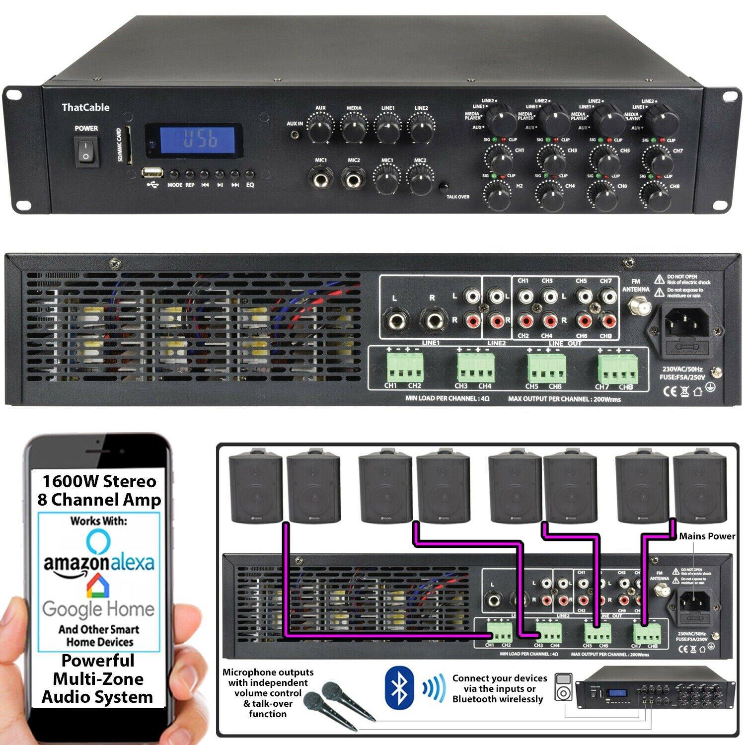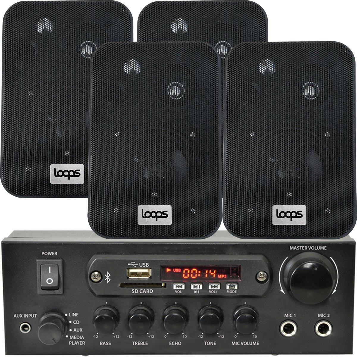 Bluetooth Wall Speaker Kit 4 Zone Stereo Amp & 8x Black Wall Background Music