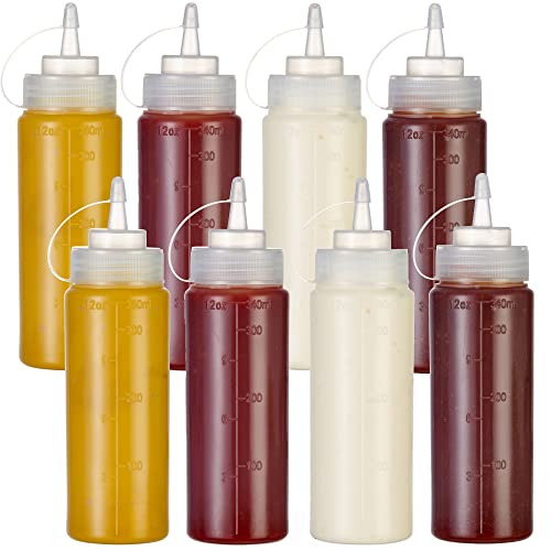 MATANA 8 Plastic Squeeze Sauce Bottles with Nozzles, 340ml - Condiments, Sauces, Ketchup, Dressings, Mustard, Olive Oil - BPA-Free & Dishwasher Safe