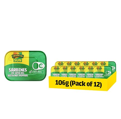 Tropical Sun Canadian Style Sardines in Hot Peppers | 106g All Natural Tinned Sardines Protein and Omega-3 | Freshly Packed Tinned Fish for a Rich & Nutritious Taste (Pack of 12)