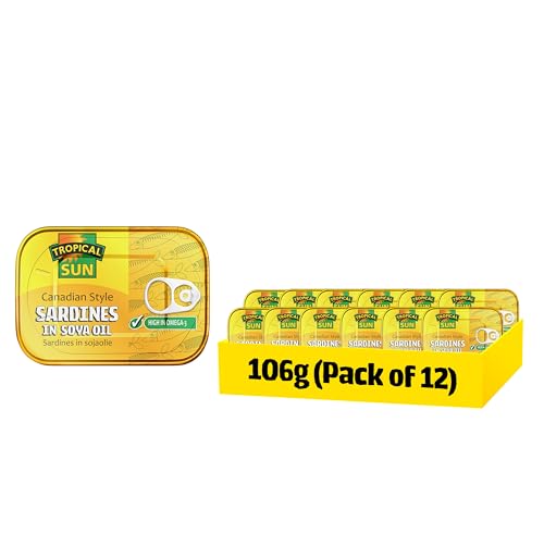Tropical Sun Canadian Style Sardines in SOYA Oil | 106g All Natural Tinned Sardines Protein and Omega-3 | Freshly Packed Tinned Fish for a Rich & Nutritious Taste (Pack of 12)