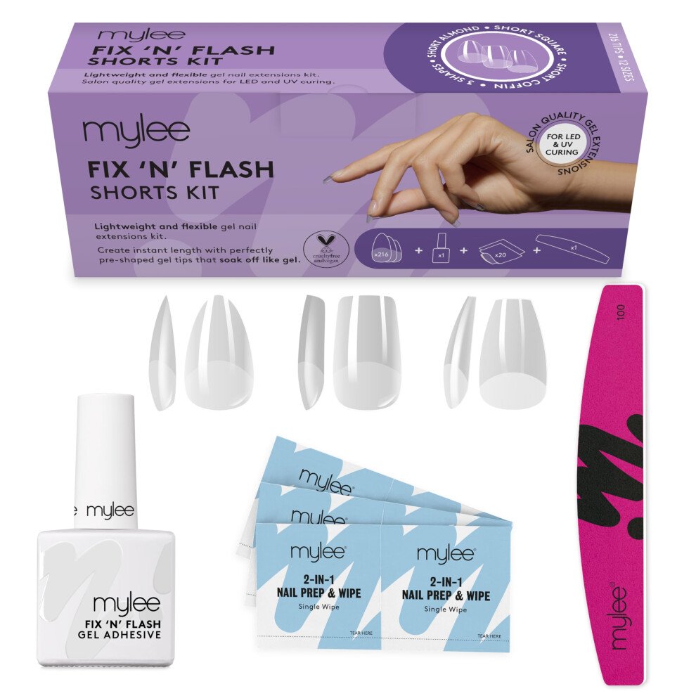Mylee Fix N Flash Soft Gel Tips Shorts Kit, 3 shapes, 216pcs, Almond, Square & Coffin, Includes Gel, Prep Wipes & Half-moon Nail File, Full Cover, Nail Art Extensions, Flexible & Resistant (10ml)