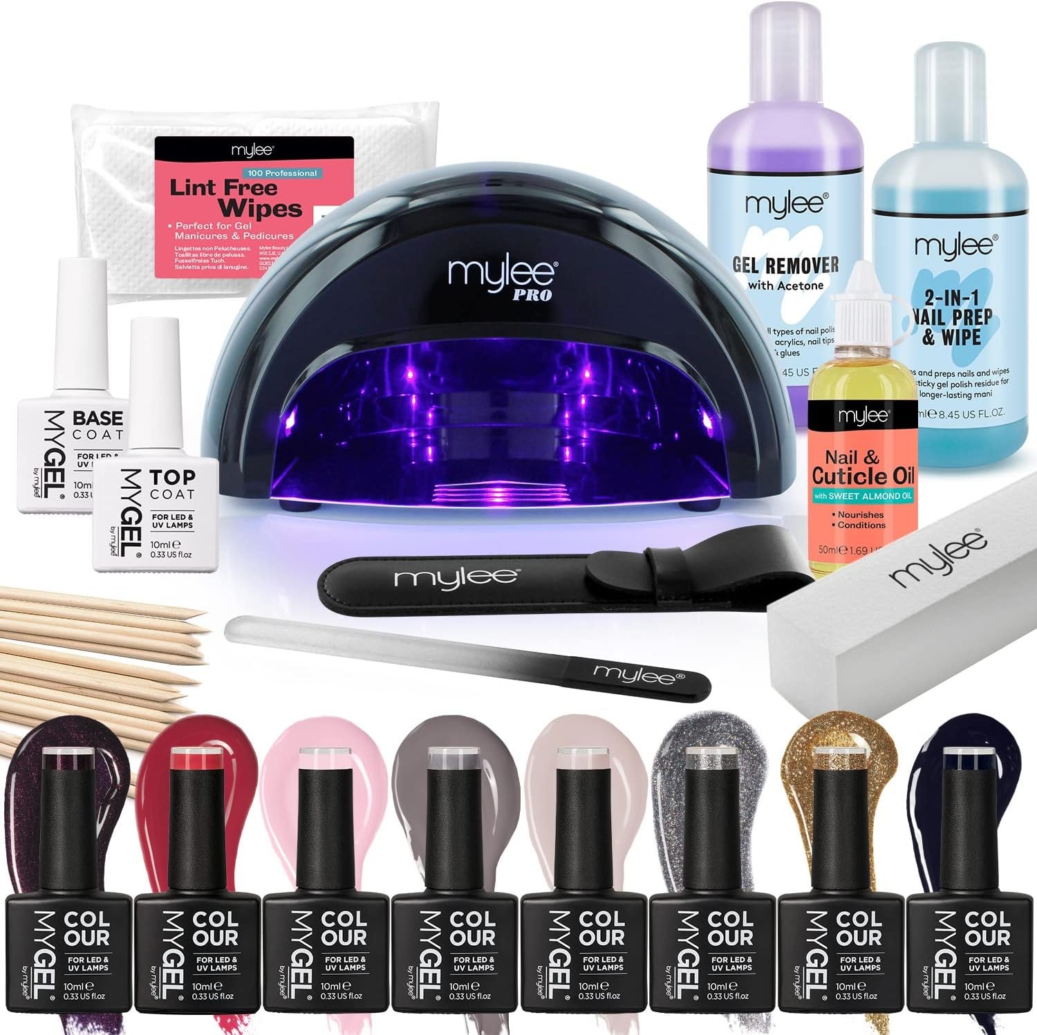 Mylee Complete Professional Gel Nail Polish LED Lamp Kit, 4x Colours, Top & Base Coat, PRO Salon Series Convex Curing® LED Lamp, Prep & Wipe, Gel Remover (Black Lamp)
