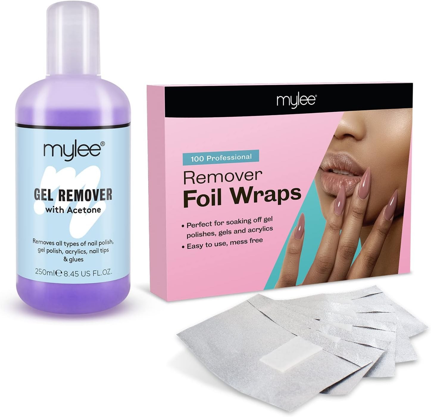 Mylee Gel Nail Polish Remover 250ml + 100pcs Alu Foil Wraps Kit, 100% Pure Acet