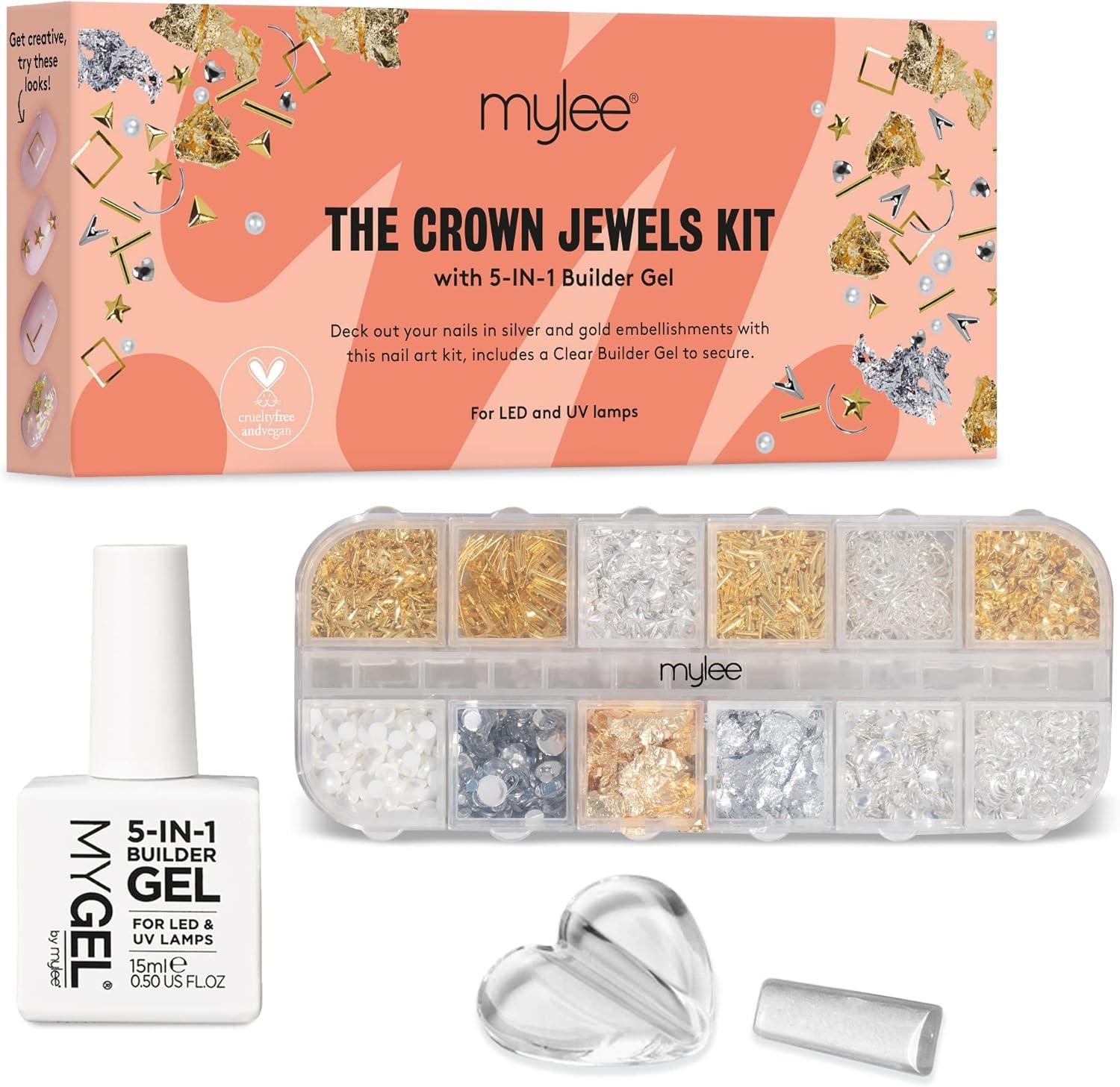 Mylee Crown Jewels Nail Art Kit, 12-Piece Set + 5 in 1 Clear Builder Gel, Silve