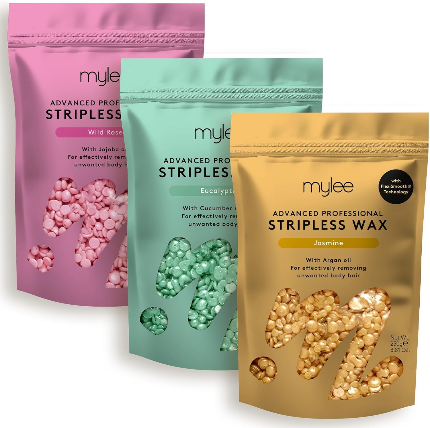 Mylee Advanced Stripless Wax Trio Set 3x250g [Jasmine, Eucalyptus, Wild Rose] Professional Hard Wax Beads, Painless Hair Removal, No Strips Needed, Peelable Hot Wax, Full Body, Face, Bikini, Brazilian