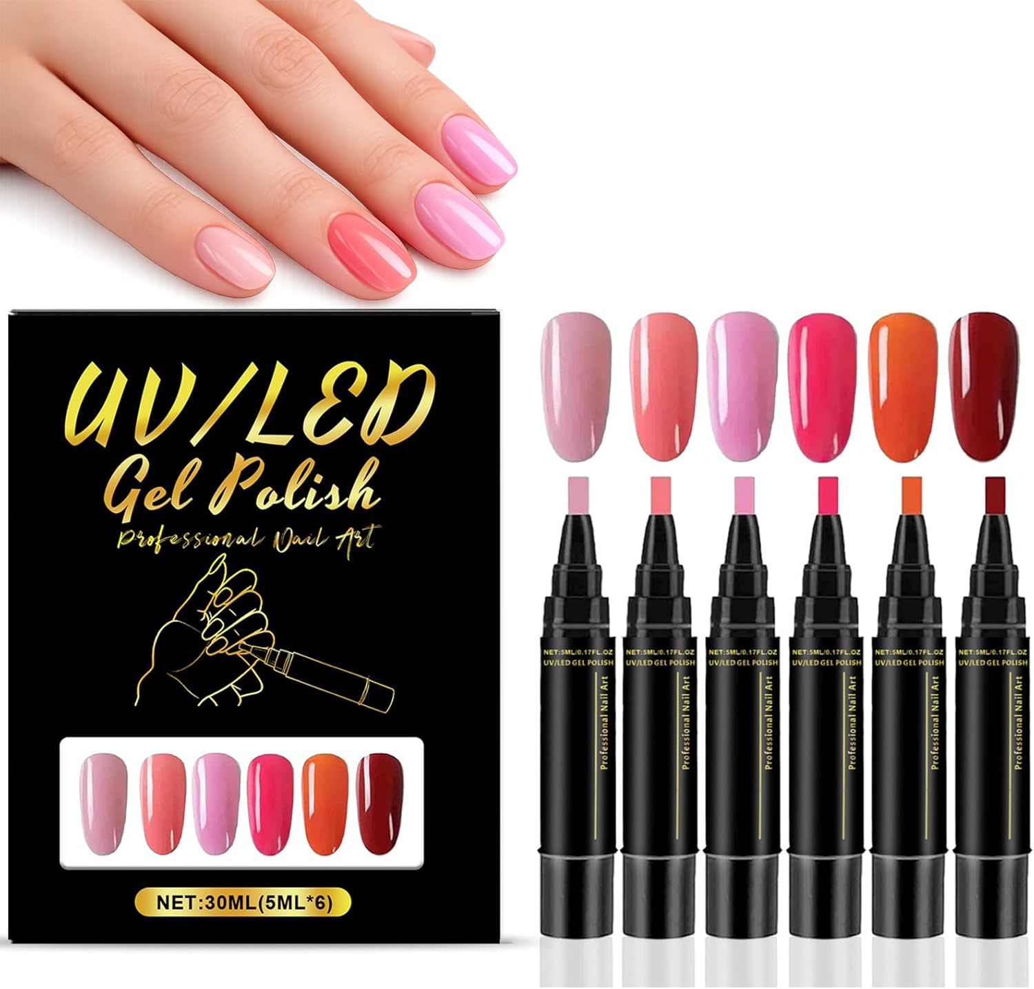 6 Pack Gel Nail Polish Pen Set, Purple Pink Red Orange Shades, Quick-Dry Nail P