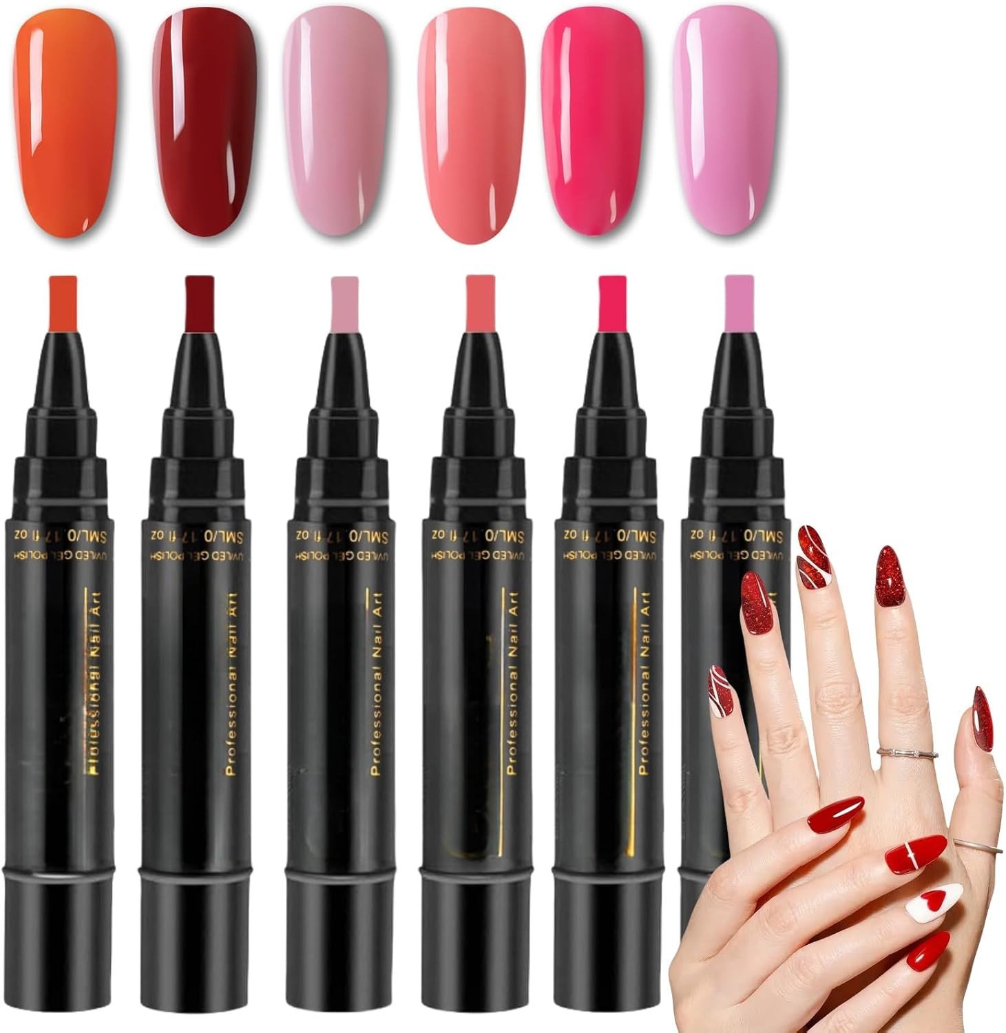 6 PCS Nail Polish Pen,Nail Gel Pen,3 in 1 Gel Nail Polish Pen,Nail Gel Painting