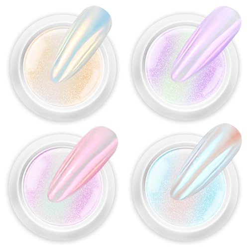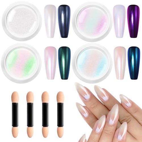 Glassy Pearl Chrome Nail Powder, BISHNGYF High Gloss White Chrome Powder for Nails, Glazed Donut Clear Ice Aurora Magic Nail Pigment Powder Mirror Effect Nail Glitter - 4Pcs Easy to Diy Decor Salon