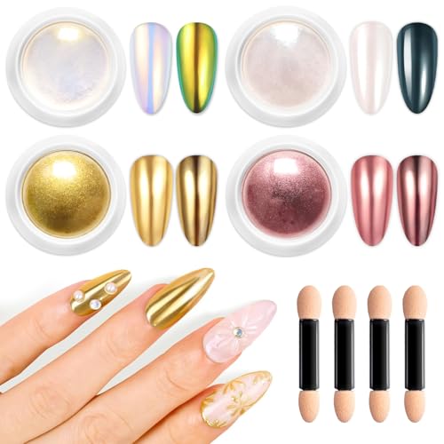 BISHENGYF Rose Gold Chrome Nail Powder: Mirror Effect Chrome Powder for Nails Glitter LONG-LASTING, Pearl Aurora Mermaid Glazed Donut Nail Powder, Ice Holo Pigment Nail Art DIY Design Decora 4-Color