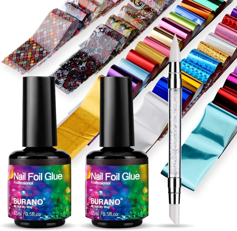 BURANO Nail Art Foil Glue Gel, 15ML 2 Bottles with 60PCS Foils Sticker, Nails D