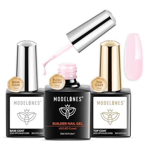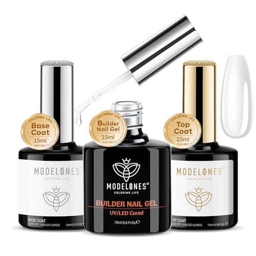 Modelones Builder Gel with Top Coat and Base Coat Set, 3Pcs No Wipe Base and Top Coat Gel Nail Polish with Gel Builder for Nails, Hard Gel Nail Strengthener Extension Builder Gel in a Bottle