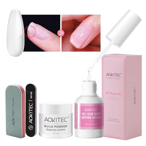 Aokitec 28g Nail Dipping Powder Kit for Nail Repair - 4 PCS Nail Repair Kit for Broken Natural Nails with Build Powder Nail Repair Glue, Quick Air Dry Nail Hardener Nail Strengthener for Damaged Nails