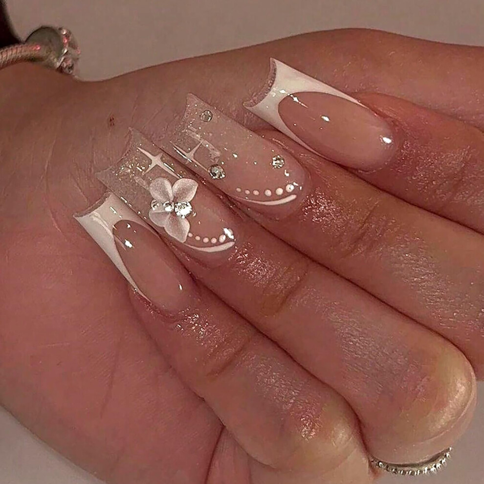 24Pcs Square Press On Nails with Rhinestones French Tip Fake Nails Acrylic Set for Women