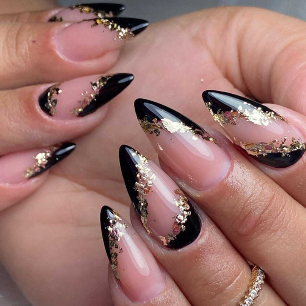 Long Almond Press on Nails Acrylic Set Reusable Fake Nails with Glue Black and Gold 24PCS