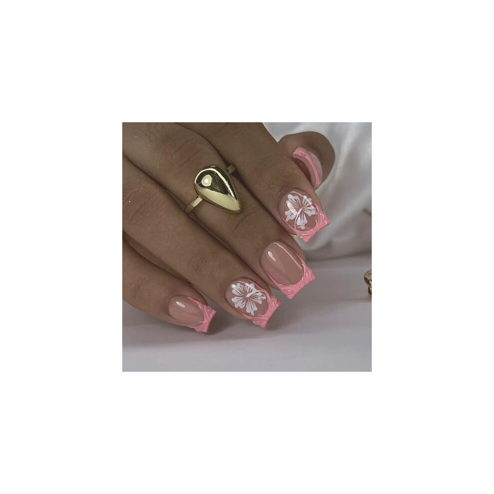 Pink French Tip Press On Nails Short Square Floral Fake Nails Acrylic Glue On Set for Women 24pcs
