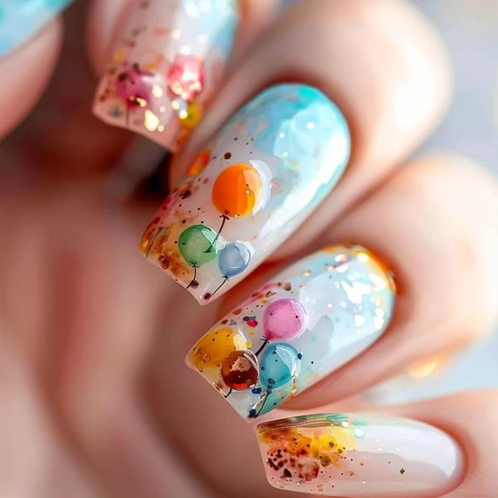 Long Coffin Press On Nails Blue Acrylic Fake Nails Set with Color Balloon Design Reusable 24pcs