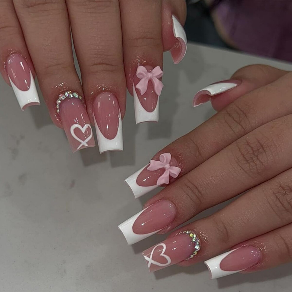 24 Pcs Long French Tip Press On Nails Square Acrylic Set with 3D Bow and Heart Design for Women