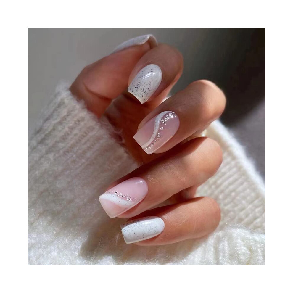 French Tip Press On Nails with Designs Square Short Fake Nails with Glue Glitter Acrylic Set 24Pcs