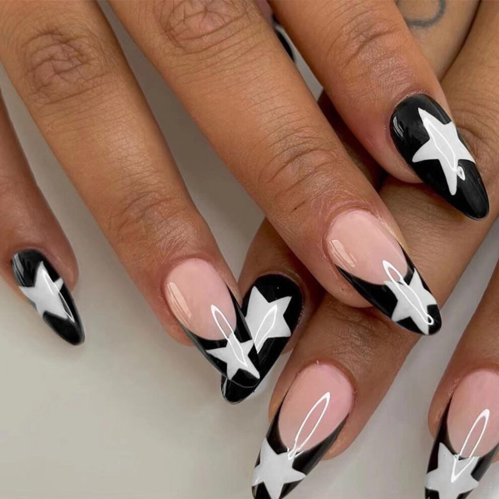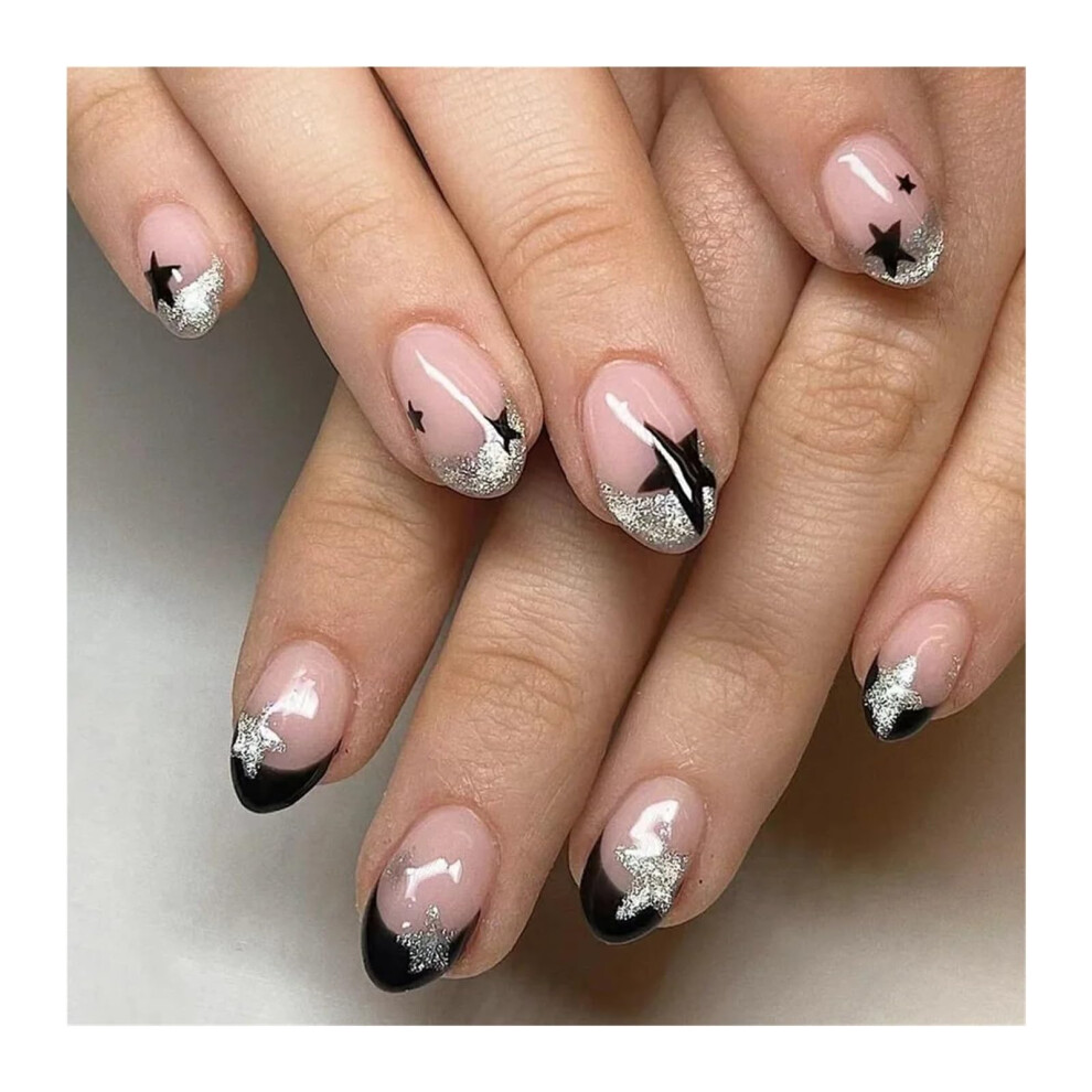 24pcs Short Oval Press On Nails French Black Glitter Star Fake Nails Reusable Acrylic Set