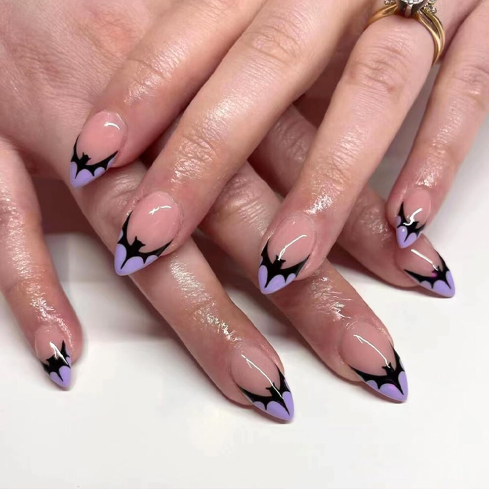 Halloween Press On Nails Purple Bat French Tip Fake Nails Short Oval Reusable Acrylic Set