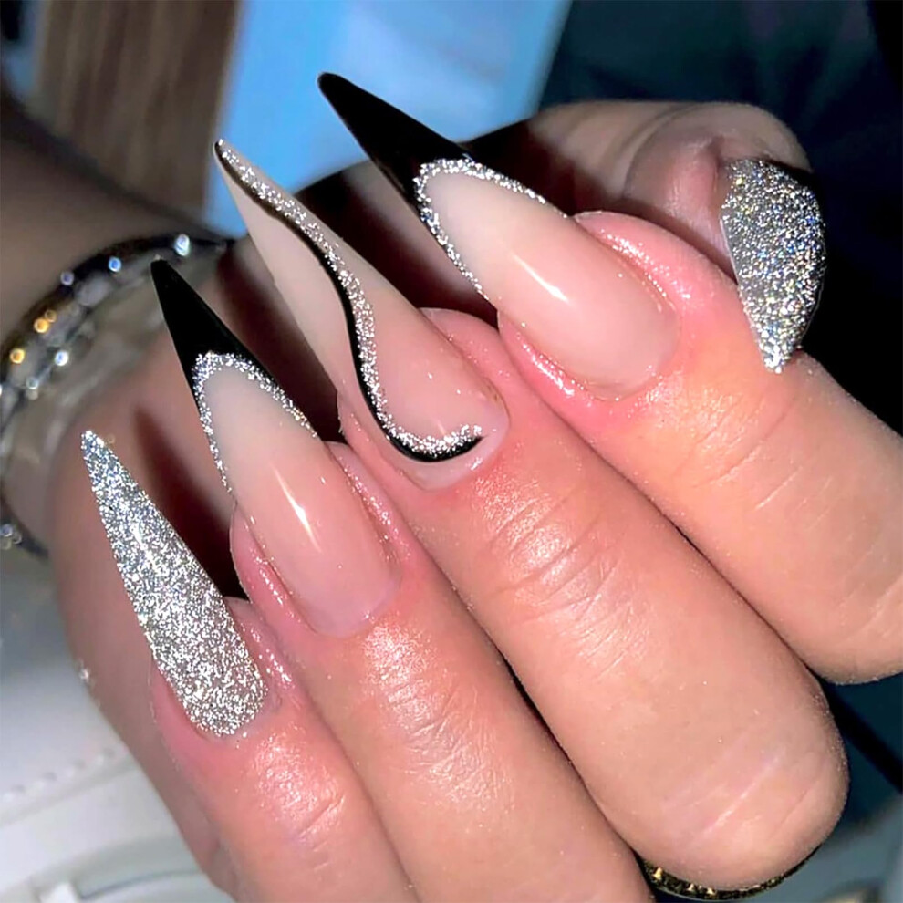 Extra Long Stiletto Press On Nails Grey Glitter Fake Nails Reusable Acrylic Full Cover Set 24pcs