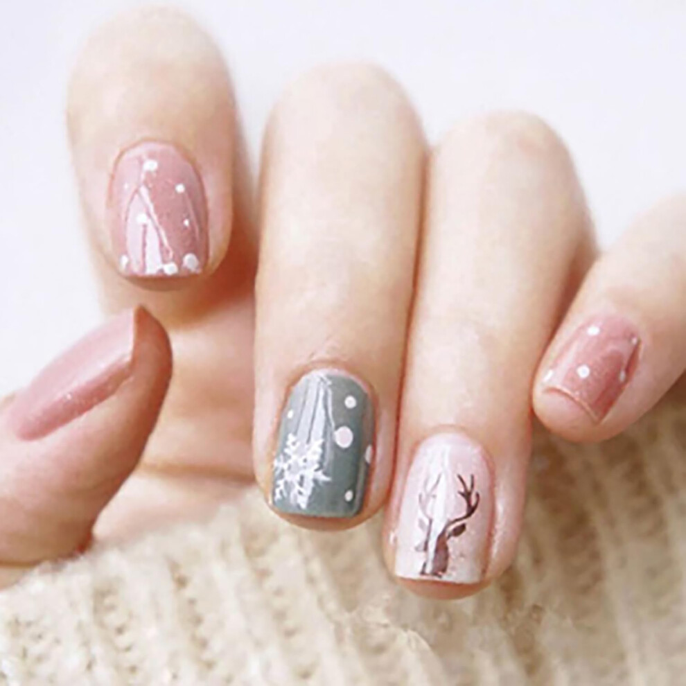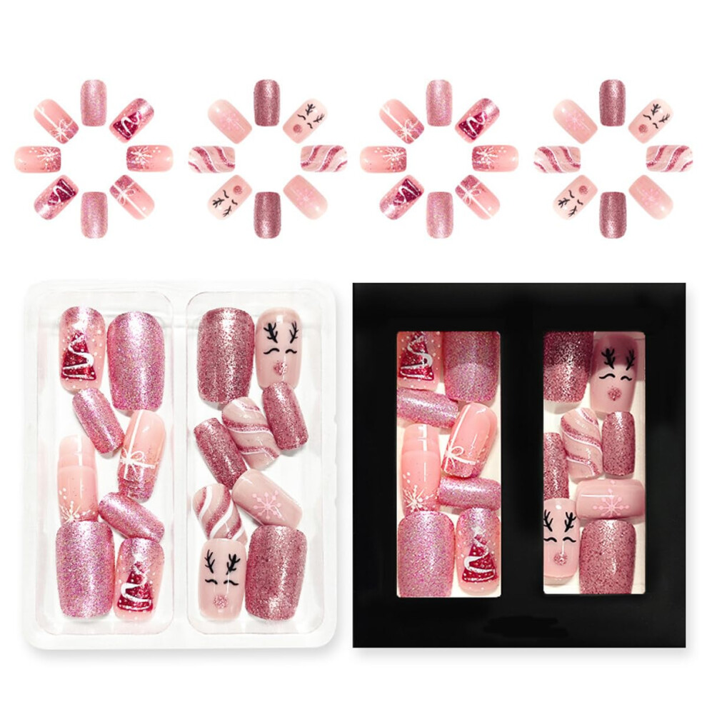 Christmas Press On Nails Short Square Acrylic Set with Cute Elk and Snowflake Designs for Women