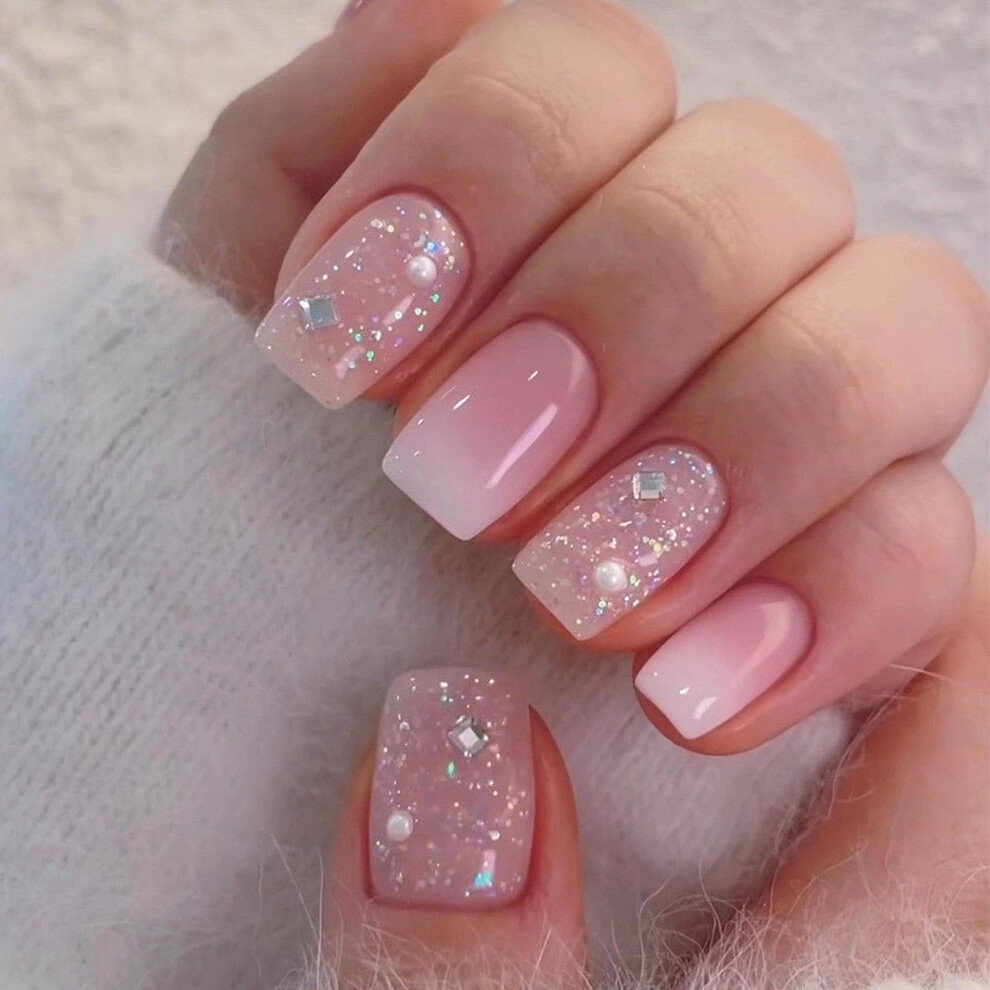 Short Square Press on Nails Pink Ombre Fake Nails with Rhinestone Glitter Acrylic Set 24pcs