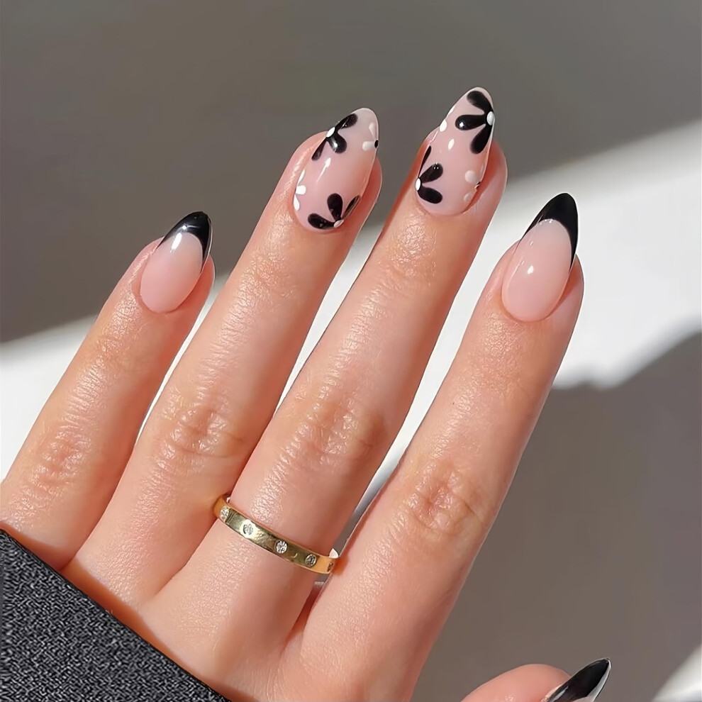 Medium Almond Press On Nails Pink and Black Floral False Nails Reusable Acrylic Set 24 Pieces