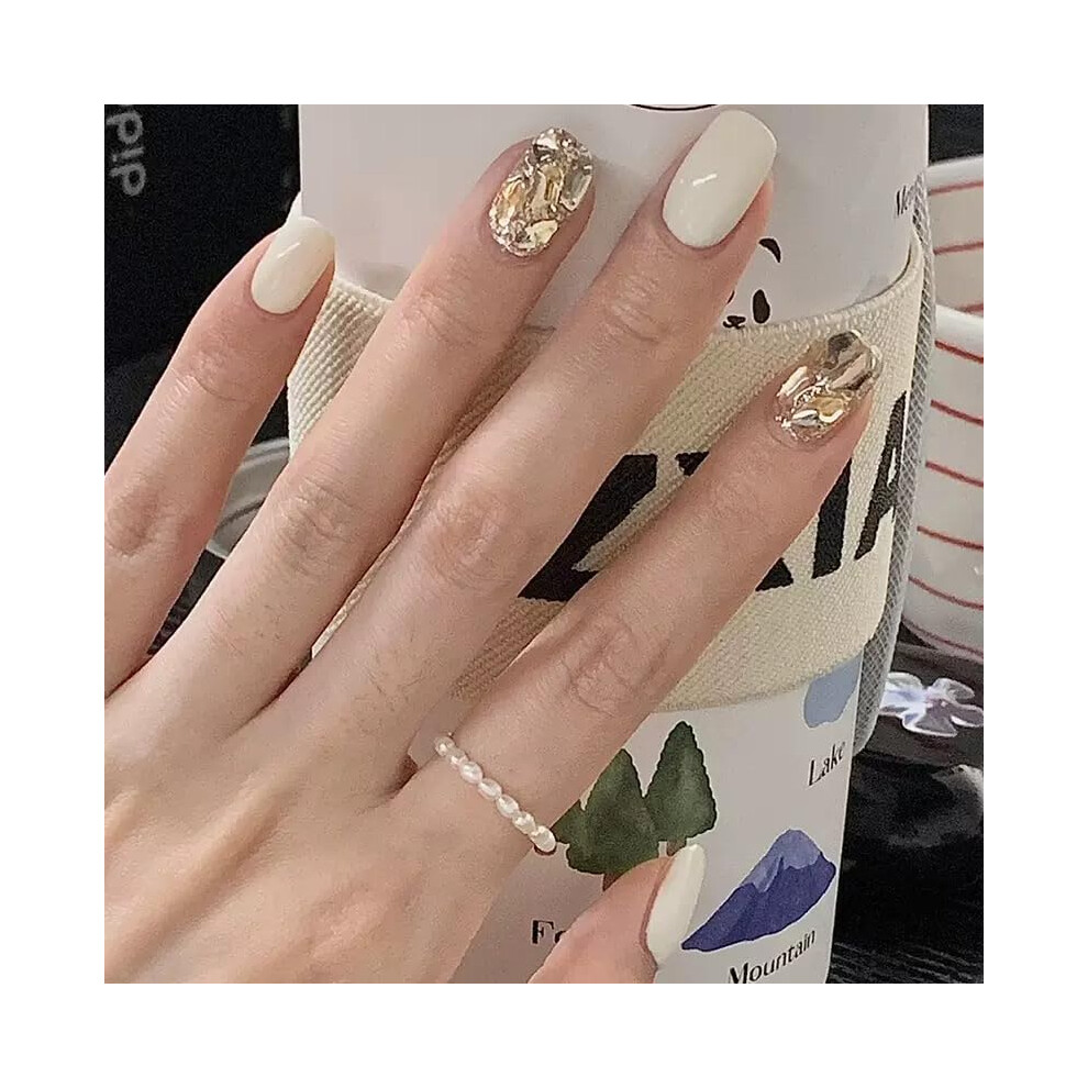 Short Square Press On Nails White and Gold Crystal Fake Nails Reusable Acrylic Manicure Set 24Pcs