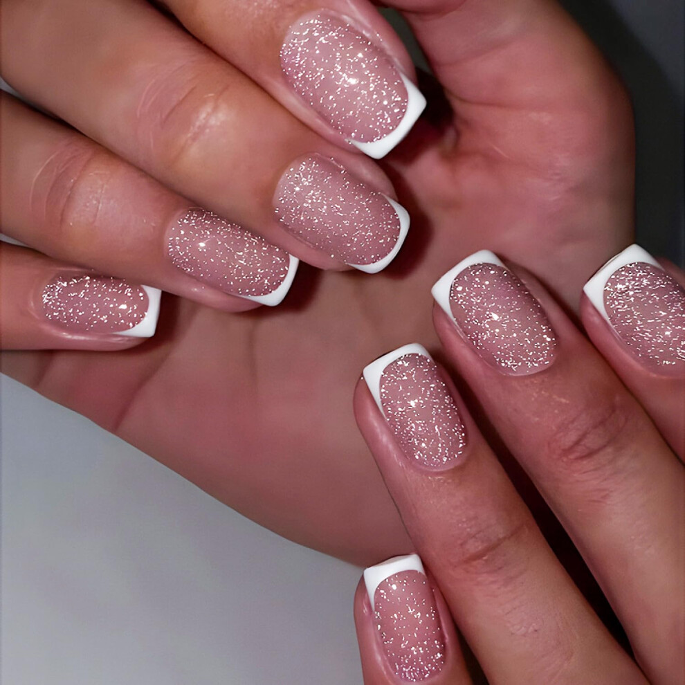 Medium Coffin Press On Nails Nude Acrylic Set with Glitter French Tips and Rhinestones 24pcs