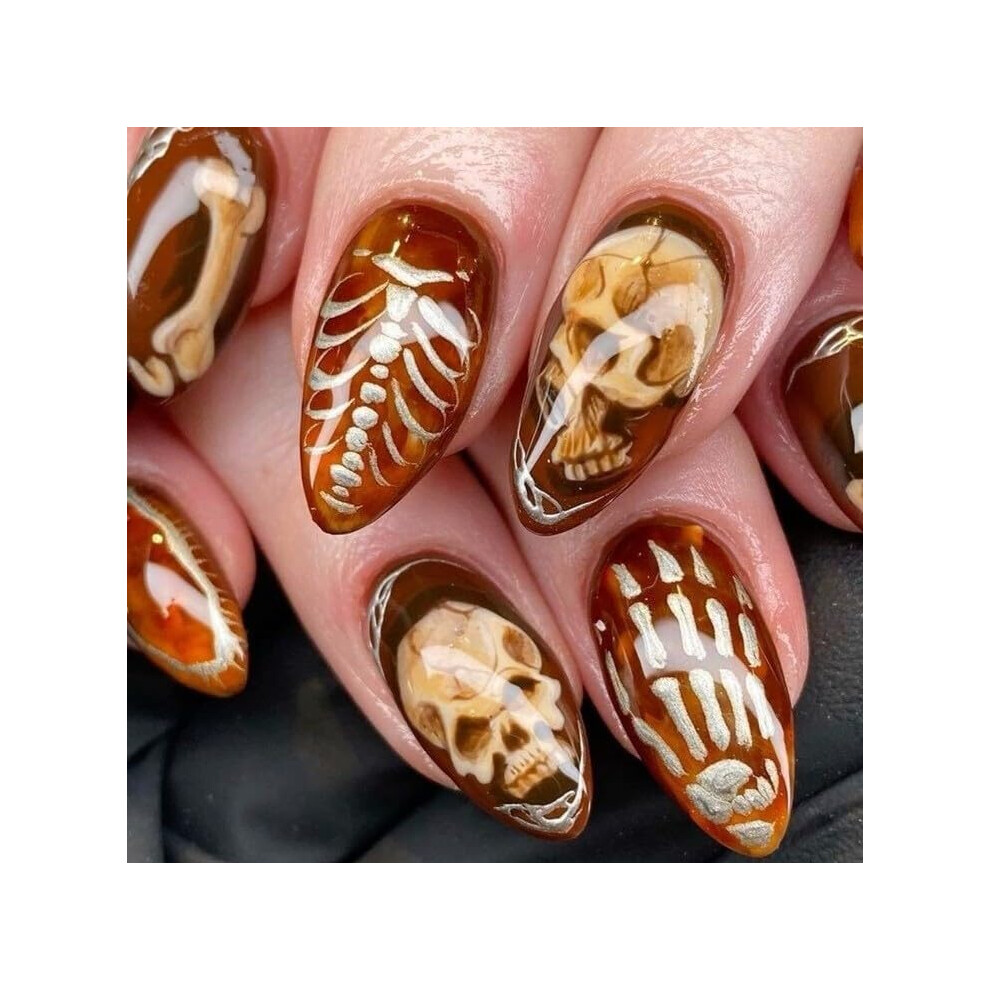 Halloween Skull Bones Press On Nails Medium Almond Fake Nails Reusable Acrylic Manicure Set