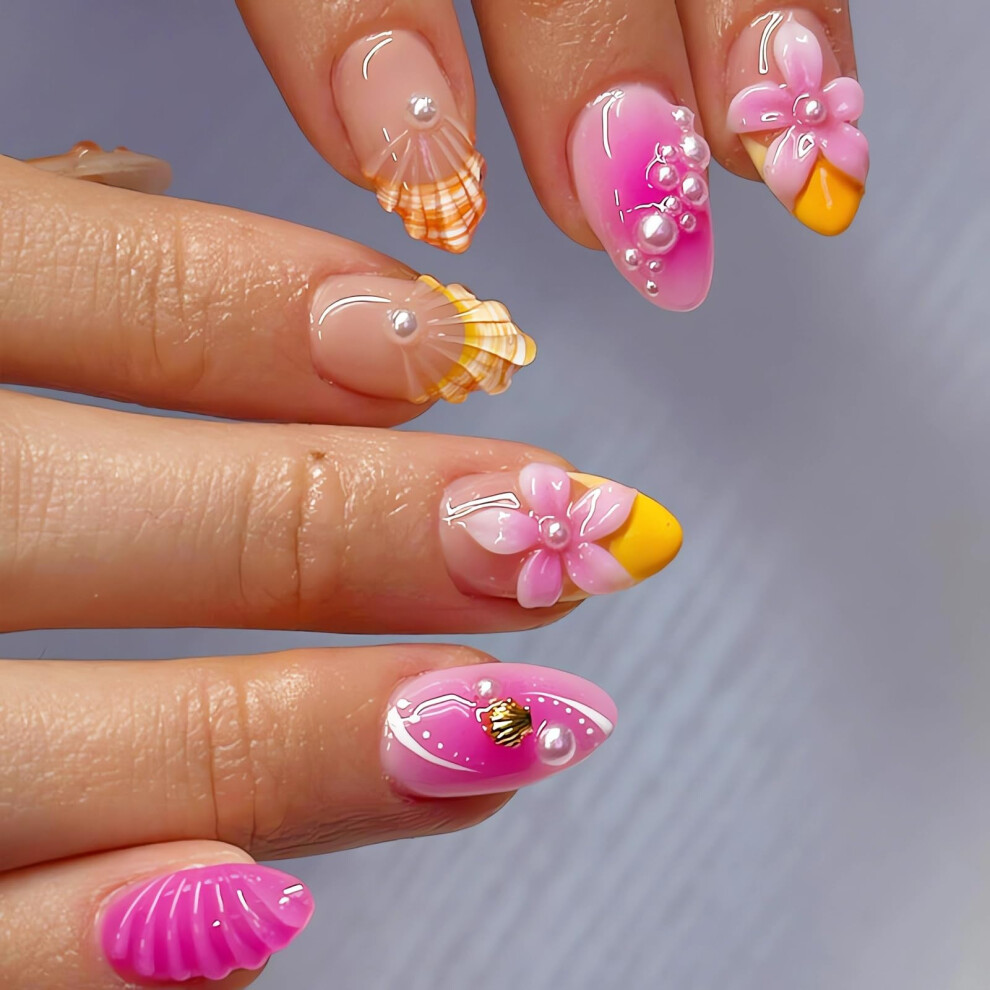 Press on Nails Almond with Pearl Design Pink Yellow French Tip Fake Nails Reusable Acrylic Set 24pcs