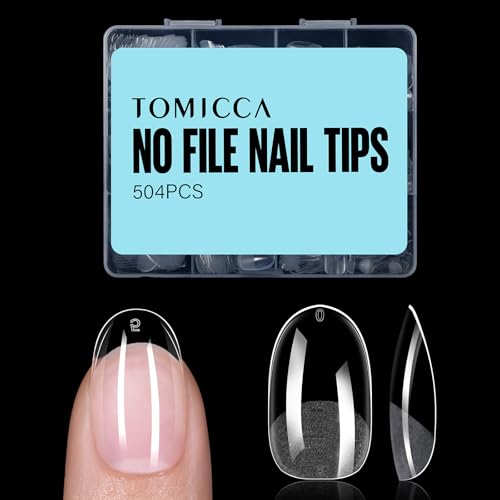 TOMICCA 504PCS Clear Medium Alomnd Nail Tips Kit - Alomnd Shape False Nails with Numbered Box for Gel Polish & Acrylic Extensions, 10 Sizes Pre-Buffed for Salon & Home DIY