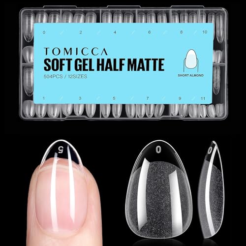 TOMICCA Short Almond Gel Nails - 504pcs Pre-Buffed No File Nail Tips, Semi-Matte Full Cover for Extensions | 12 UK Sizes Break Resistant Tips for Salon & Home DIY