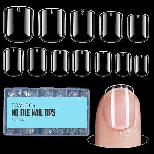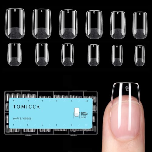 TOMICCA Easy Apply Short Square Nail Tips - 504pcs Pre-Sized False Nails with Box, Breathable ABS Gel/Acrylic Extensions for Home DIY Nail Art