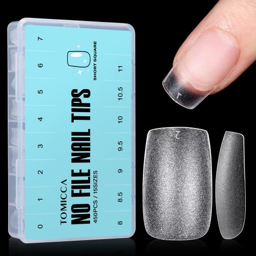 TOMICCA Short Square Nail Tips - 450Pcs Soft Gel Nail Tips Square Shaped Full Cover Nails Pre Etched for Extensions, Matte Break Resistant Strong False Nails for Salon and Home DIY, 15 Sizes