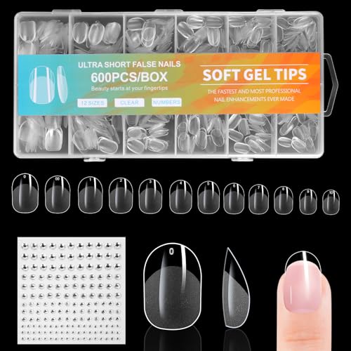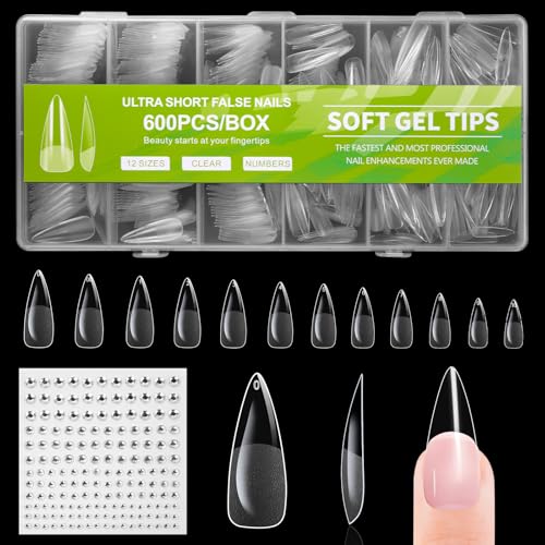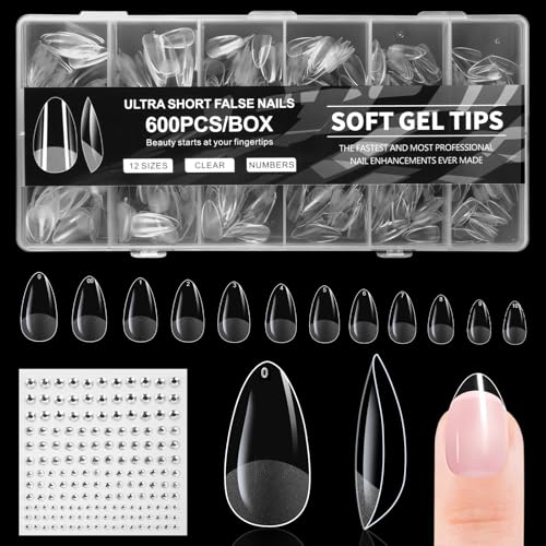 BUTBU Short Almond Nail Tips, 600Pcs Soft Gel Full Cover Nail-Tip, Press on Fase Artificial Nails Tips, Clear Acrylic Nails Tips, 12 Sizes NAIL Extensions Kit for DIY Manicure Nail Art Salon