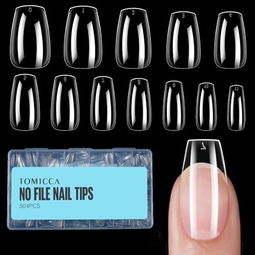 TOMICCA 504PCS Clear Medium Coffin Nail Tips Kit - Coffin Shape False Nails with Numbered Box for Gel Polish & Acrylic Extensions, 10 Sizes Pre-Buffed for Salon & Home DIY