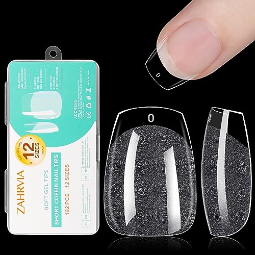 Short Coffin Nail Tips -ZAHRVIA Soft Gel Full Cover Nail Tips for Soak Off Extensions kit - 192PCS False Nails 12 Sizes (Short Coffin)