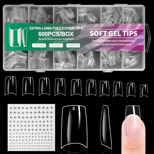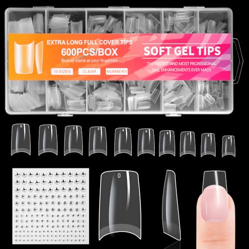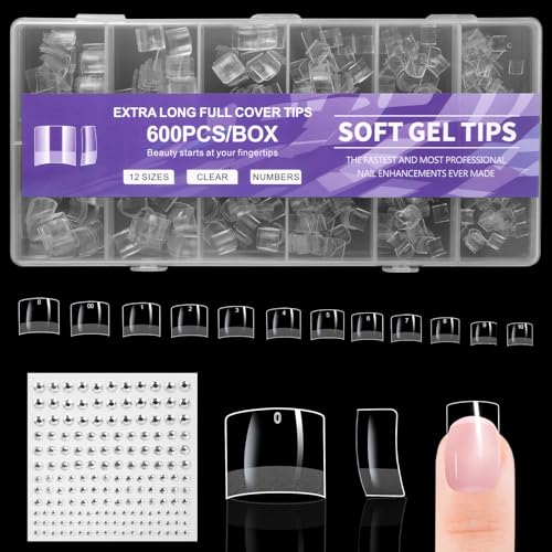 BUTBU Long Coffin Nail Tips, 600Pcs Soft Gel Full Cover Nails-Tips, Clear Acrylic False Press on Nail Tip, 12 Sizes NAIL Extensions Kit for DIY Manicure Art Salon