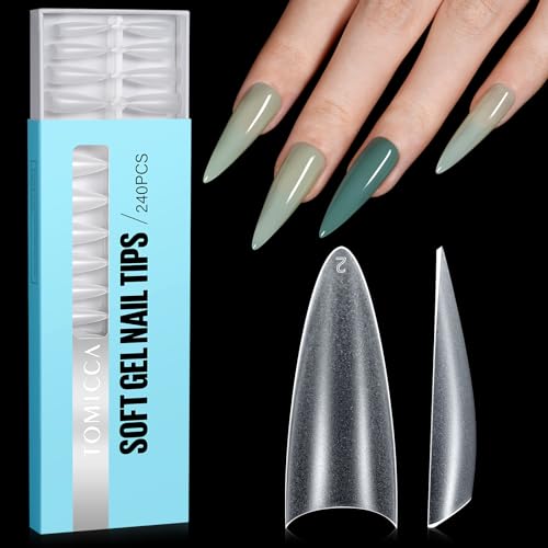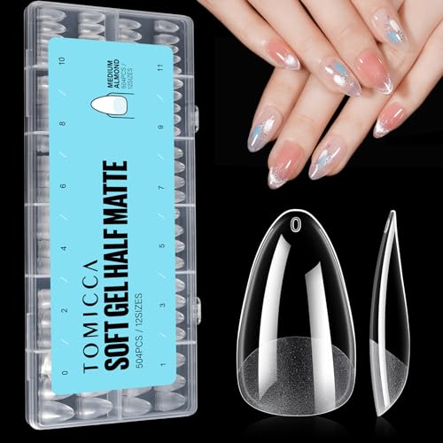 TOMICCA Medium Almond Nail Tips, 240Pcs Half Matte Clear Soft Gel Almond Shaped Nails Tip, Full Cover Acrylic Fake Nails for French Nail Extensions DIY Nail Art, 15 Sizes