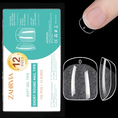 Short Round Nail Tips - Clear Nails Tip, ZAHRVIA Soft Gel Full Cover for Soak Off Nail Extensions Kit - 192PCS 12 Sizes
