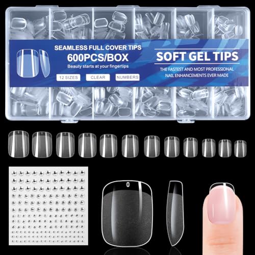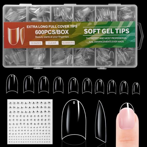 BUTBU Nail Tips, 600PCS Soft Gel Full Cover Nail-Tip, Press on Fase Artificial Nails Tips, Clear Acrylic Nails Tips, 12 Sizes NAIL Extensions Kit for DIY Manicure Nail Art Salon (Medium Oval)