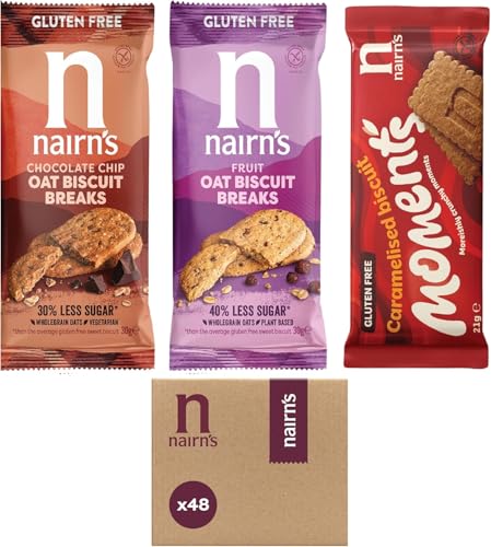 Nairn's Oat Biscuit Breaks - Variety Pack - Gluten-Free Oat Biscuits - Healthy Snacks - 3 Flavours: Choc Chip, Fruit & Caramelised Biscuit Moments - Pack of 48 (3 Biscuits per Pack)