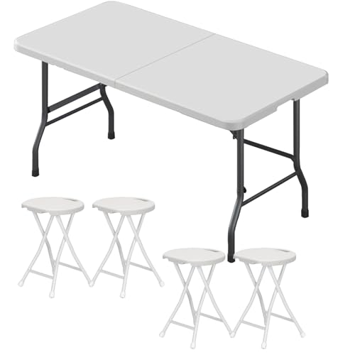 Outdoor Fold-In-Half Utility Table, Portable Folding Beach Table With Handle Foldable Camping Table For Indoor Kitchen, Dormitory, Picnic, Party(5ft white+chair*4)