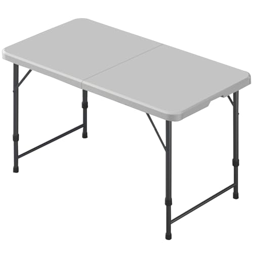Folding Table 4ft Portable Adjustable Height Fold-in-Half Utility Trestle Camping Indoor and Outdoor Picnic Party Dining Camp Barbecue Table with Handle